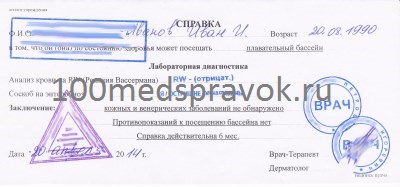 | Образец медицинской справки в бассейн для взрослого (с 14 лет) |
